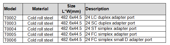 This fiber optic patch panel is 19inch rack mounted, 1U height for loading 24pcs LC duplex or 24pcs SC duplex adapters.