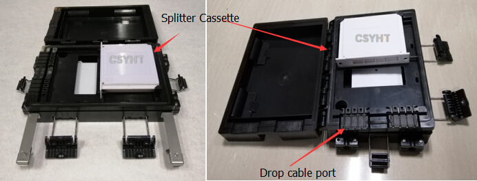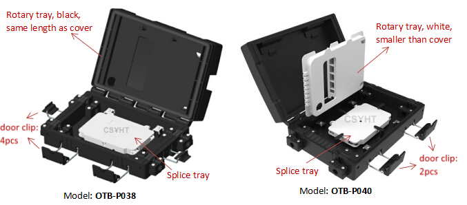 OTB-P038 is a plastic outdoor aerial hanged mounted fiber optic terminal box. It has two layer space. The upper space load a plastic splitter cassette that load PLC steel tube type splitter 1:2, 1:4, 1:8; also it support 8 drop cable output.