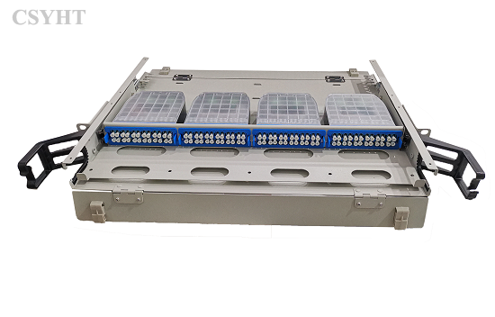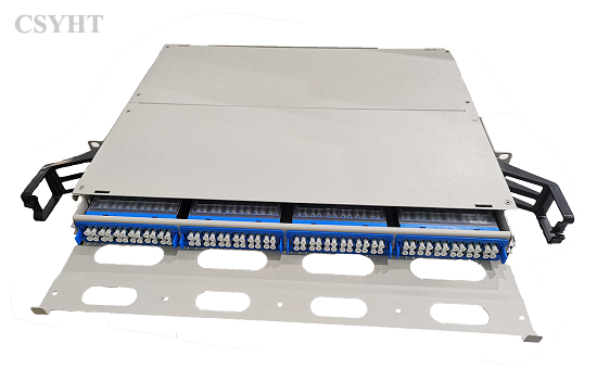 It is sliding type 1U height for 19inch rack mounted application. It can 4pcs MPO cassettes HD-07 for max. 96 fiber connection and distribution. There are cable fixing kit at back side of patch panel and with cable management rings at front side of patch panel. It has front and rear metal doors.