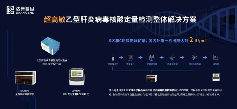 達(dá)安基因在病原體核酸檢測(cè)領(lǐng)域形成了日臻豐富的解決方案,助力臨床疾病的精準(zhǔn)診療。達(dá)安基因最新上市的超高敏乙型肝炎病毒核酸定量檢測(cè)試劑及整體解決方案,是國(guó)內(nèi)外唯一檢出限達(dá)2 IU/mL,滿足權(quán)威指南高靈敏精準(zhǔn)檢測(cè)要求;針對(duì)S區(qū)和C區(qū)雙靶標(biāo)擴(kuò)增,提高對(duì)病毒變異株檢出,積極朝著實(shí)現(xiàn)“消除病毒性肝炎”的目標(biāo)邁進(jìn)。