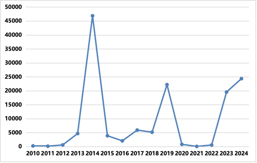 2010-2024年中國登革熱病例報告數