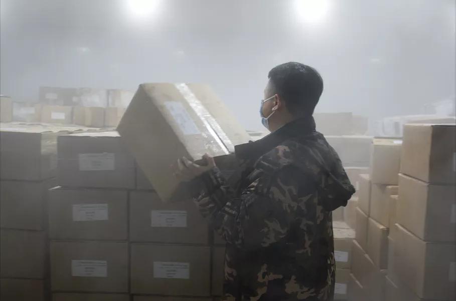 除了冒著病毒風(fēng)險(xiǎn),他們還要忍受酷暑。6月的廣州,室外氣溫高達(dá)35℃。待在外面一會(huì)兒,人就被熱浪沖暈。但為了保存生物活性,達(dá)安基因新冠核酸檢測(cè)試劑盒,冷庫的存儲(chǔ)溫度為-20±5℃。每一次,工作人員進(jìn)入冷庫搬運(yùn)檢測(cè)試劑時(shí),都要穿上厚厚的羽絨服,才能抵御低溫。
