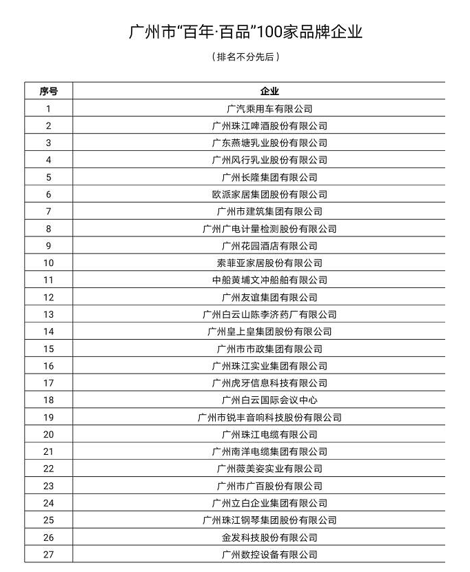 7月6日,廣州市質量強市工作領導小組辦公室發布廣州市“百年·百品”100家品牌企業名單,來自廣州本土的100家品牌企業入選。這是廣州全面展示質量品牌建設成就,獻禮中國共產黨百年華誕,推動高質量發展、建設質量強市的一次重要行動。據介紹,此次“百年·百品”評選活動,是在中國共產黨成立100周年這個重要時間節點推出的品牌系列活動。自今年4月啟動以來,有近400家品牌企業參加評選角逐,涵蓋服務、制造、建筑和農業等行業。經過初評、網絡人氣投票及專家評審,同時綜合考量入圍品牌企業的體量規模、經營業績、行業影響力、品牌競爭力、社會貢獻、社會美譽度等因素,最終推選出100家具有廣泛代表性、在全市全省全國乃至全球具有影響力的廣州品牌企業。