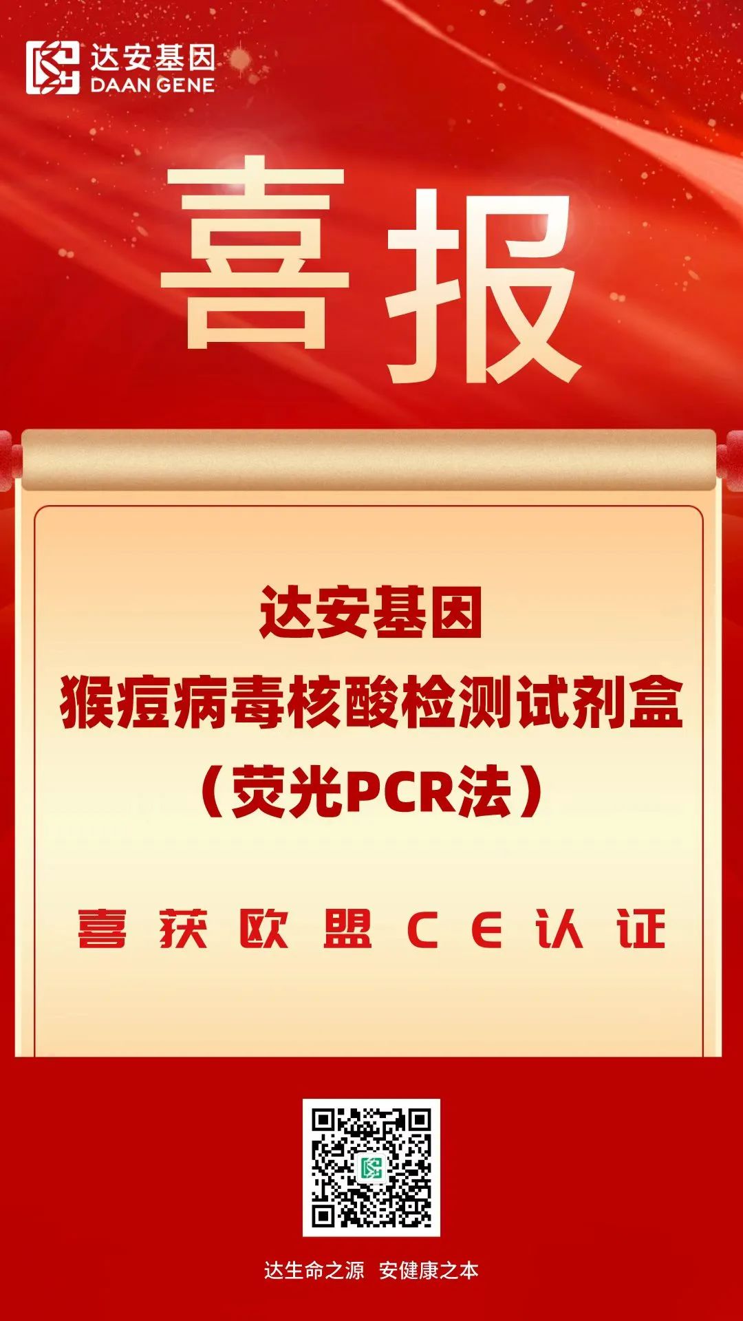 5月23日晚,達安基因研發的“猴痘病毒核酸檢測試劑盒(熒光PCR法)”獲得歐盟CE準入資格!這意味著該試劑盒可在歐盟國家以及認可歐盟CE認證的國家進行銷售。