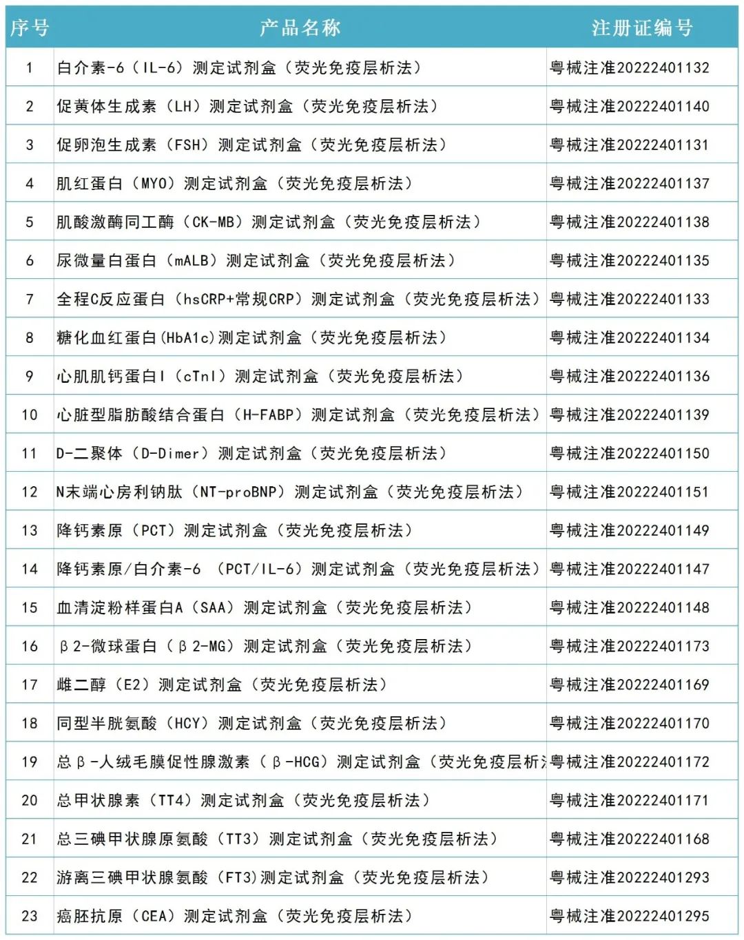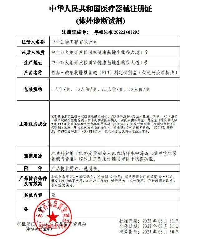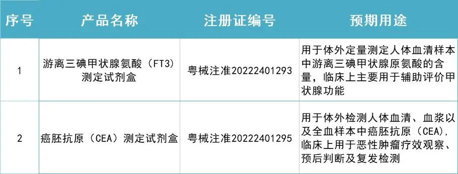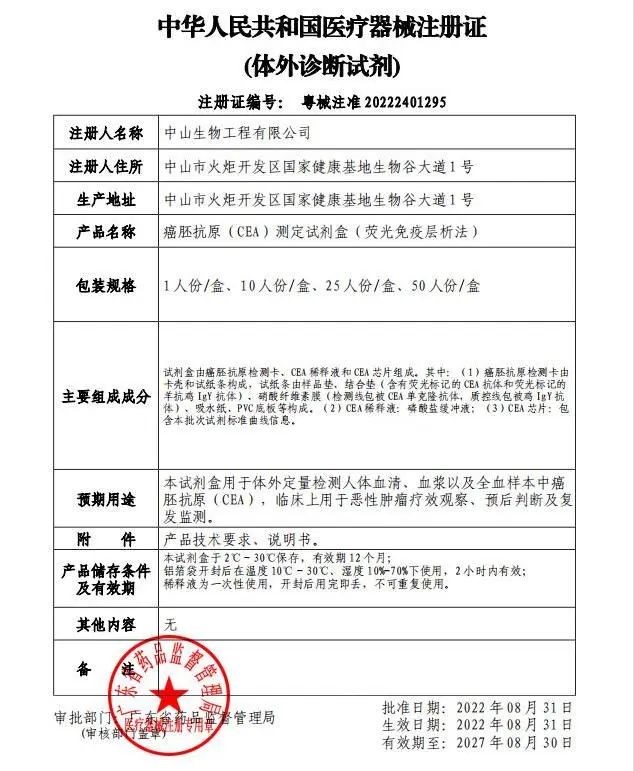 達(dá)安基因下屬全資子公司中山生物工程有限公司,2項產(chǎn)品于2022年9月2日又獲廣東省藥品監(jiān)督管理局頒發(fā)的《醫(yī)療器械注冊證》。分別是游離三碘甲狀腺氨酸(FT3)測定試劑盒(熒光免疫層析法)、癌胚抗原(CEA)測定試劑盒(熒光免疫層析法)。