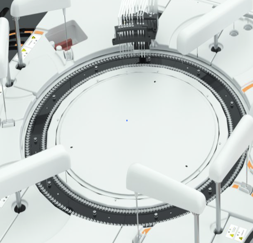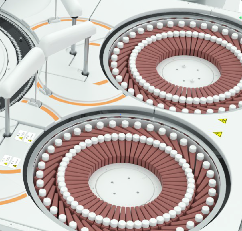 加樣針獨立非同步進行,有效提升測試速度,雙盤設計,共有168個試劑位,單盤故障時不影響另一個盤的正常運行。