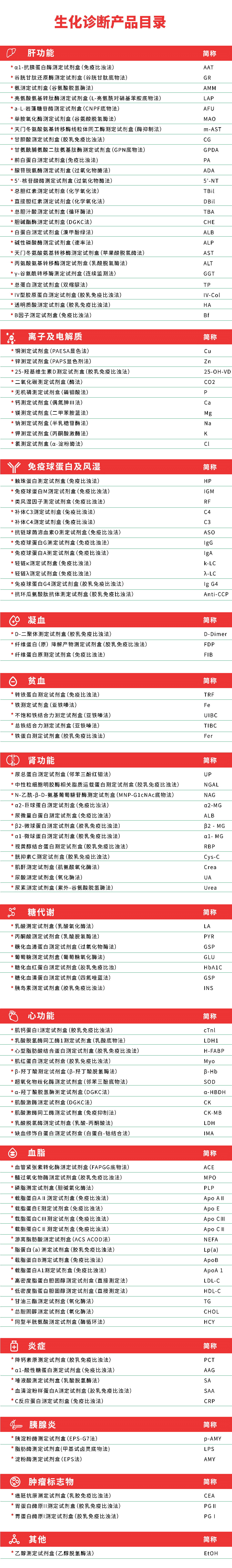 此外,達安基因目前已獲證的配套生化試劑涵蓋肝功能、腎功能、心功能、離子及電解質、免疫球蛋白及風濕、凝血、貧血等總計114項,試劑性能優越,品類豐富,備貨充足。以下是生化診斷試劑產品目錄: