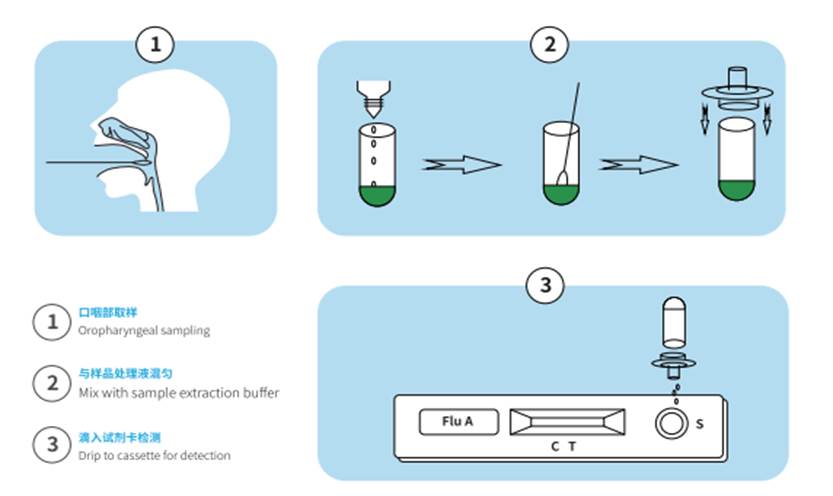 甲型流感病毒抗原檢測試劑操作十分簡便。 根據試劑說明書,只需將采集樣本后的咽拭子立即置于采樣管中,拭子頭應在保存液中充分混勻,同時用手隔著采樣管外壁擠壓拭子頭,確保樣本充分洗脫于采樣管中。